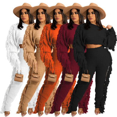 Solid color knitted long sleeve tassel suit(AY1480)