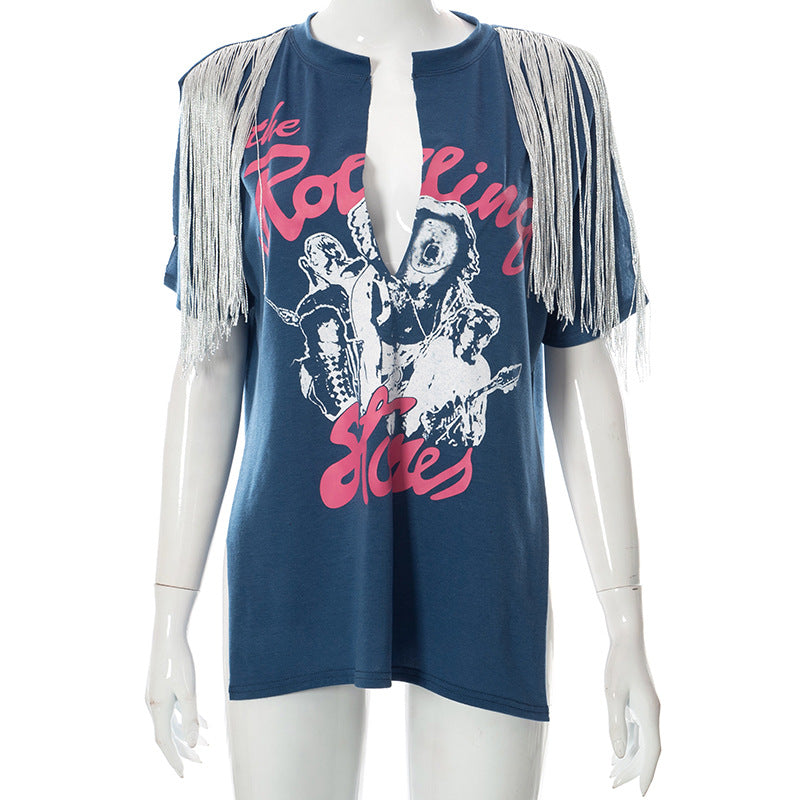 Fashion Printed Fringe Short Sleeve T-Shirt(AY1793)