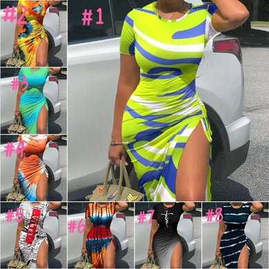 Camouflage printed lapel short sleeved split skirt set AY2740