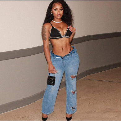 Fashionable ripped jeans chain beaded chain Straight-leg pants