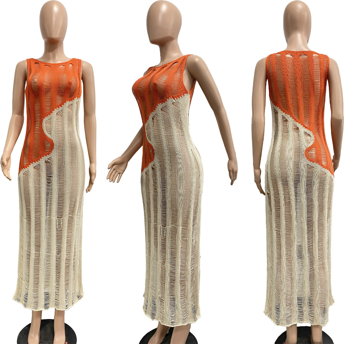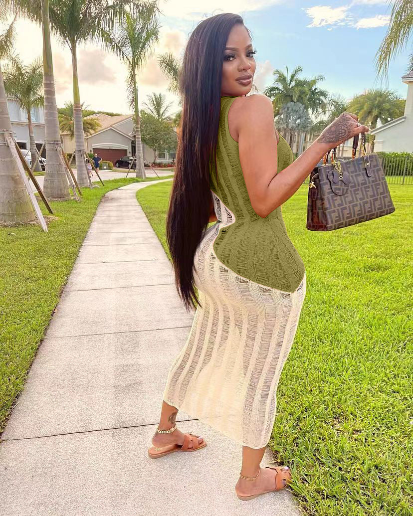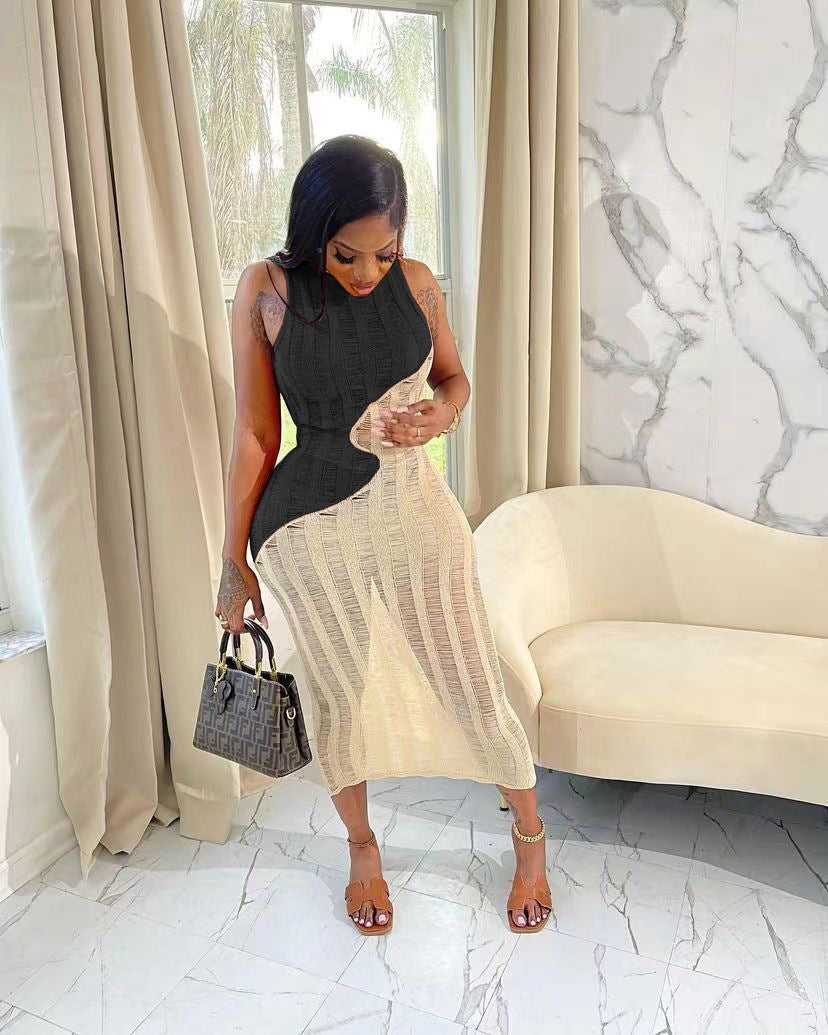 Sexy sleeveless knitted color blocking dress AY2936