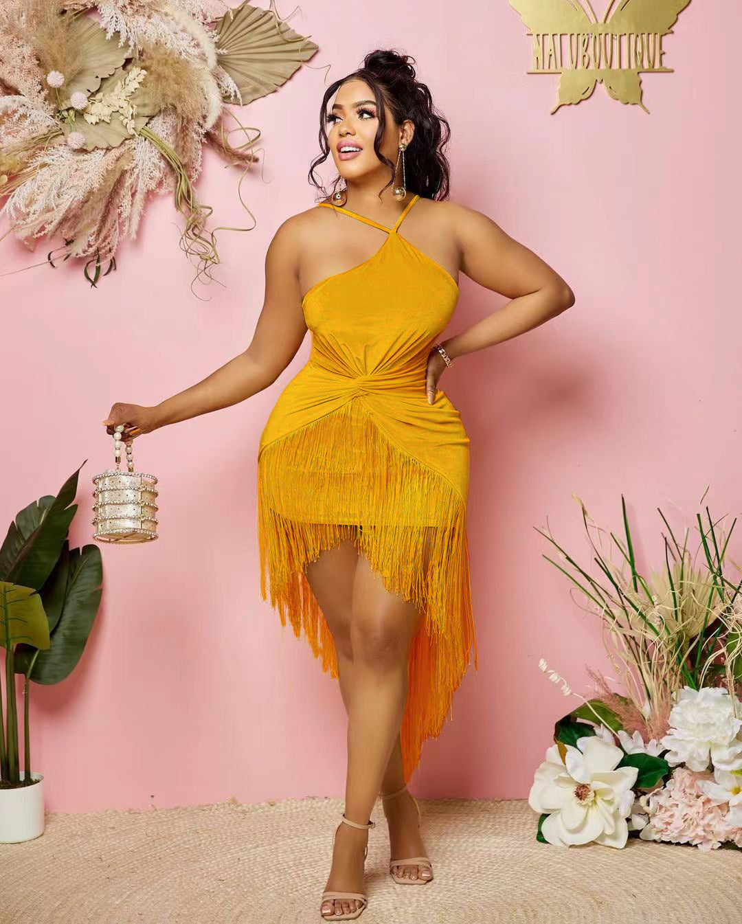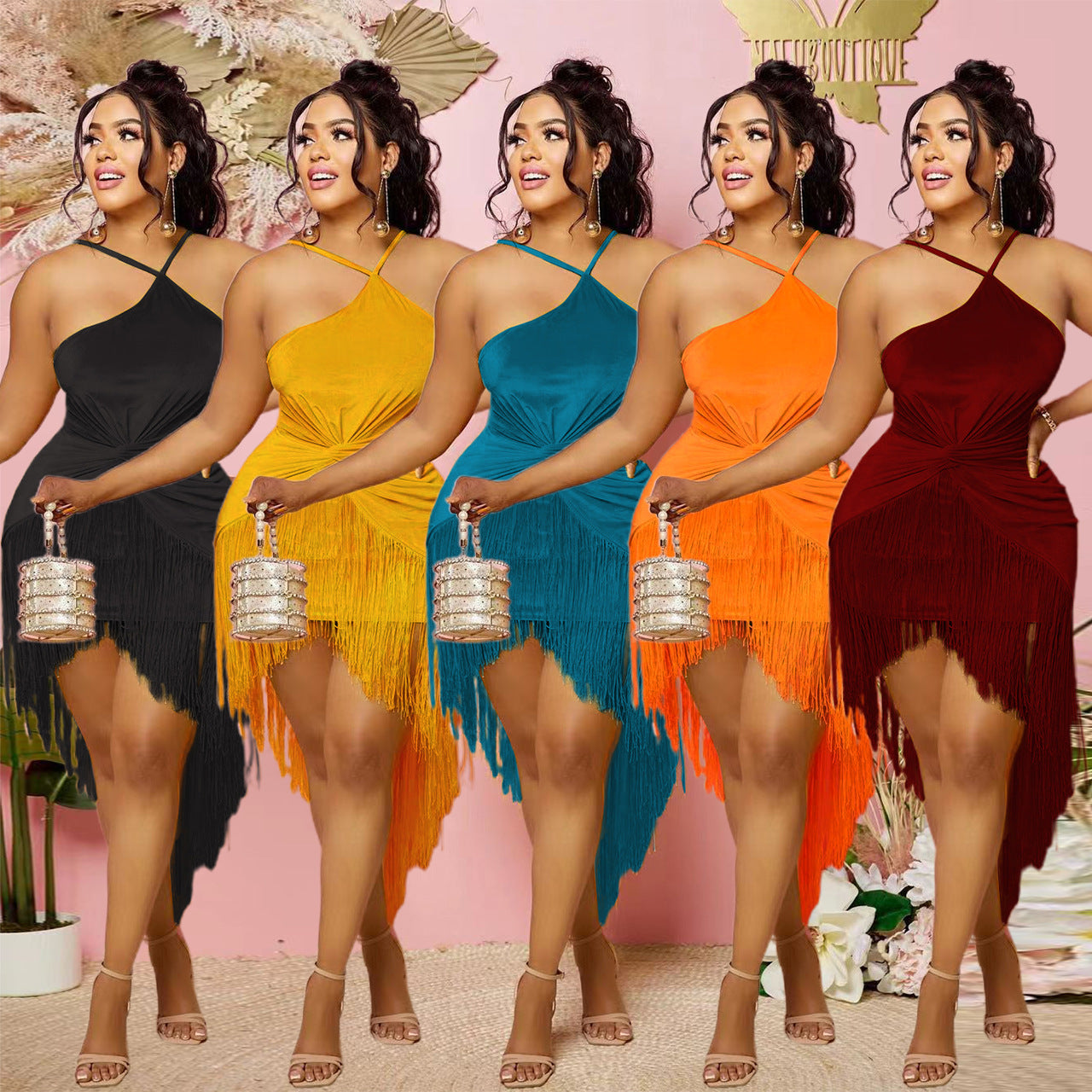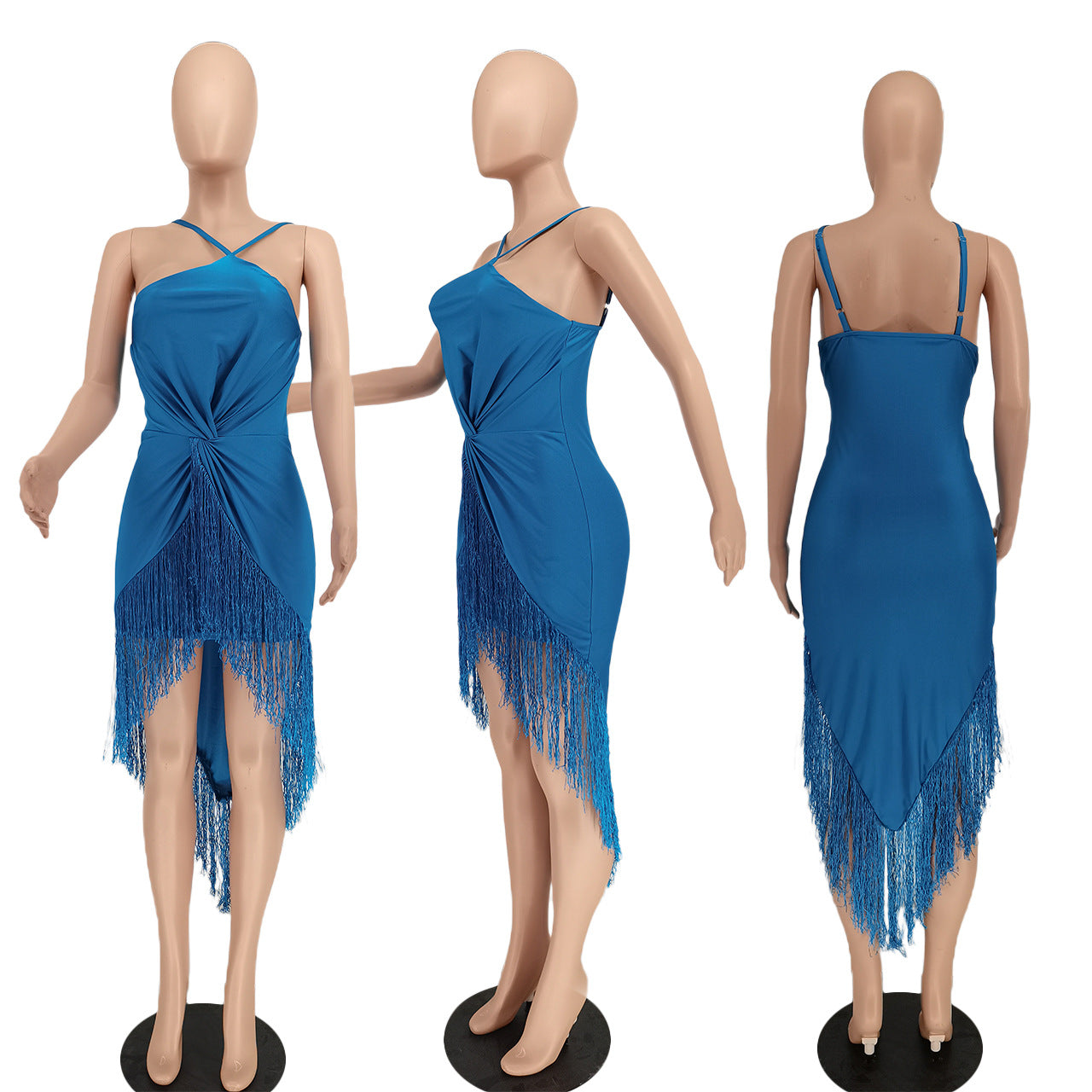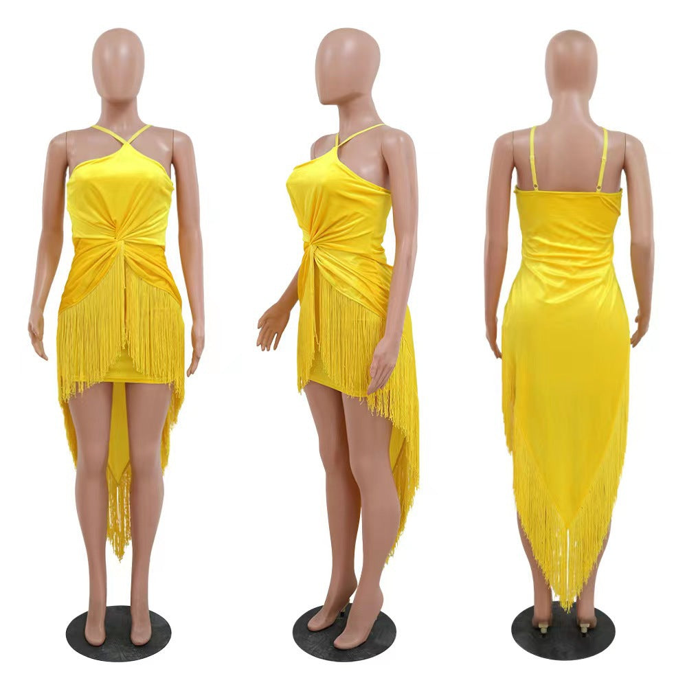 Sexy solid color hanging neck tassel dress AY2814