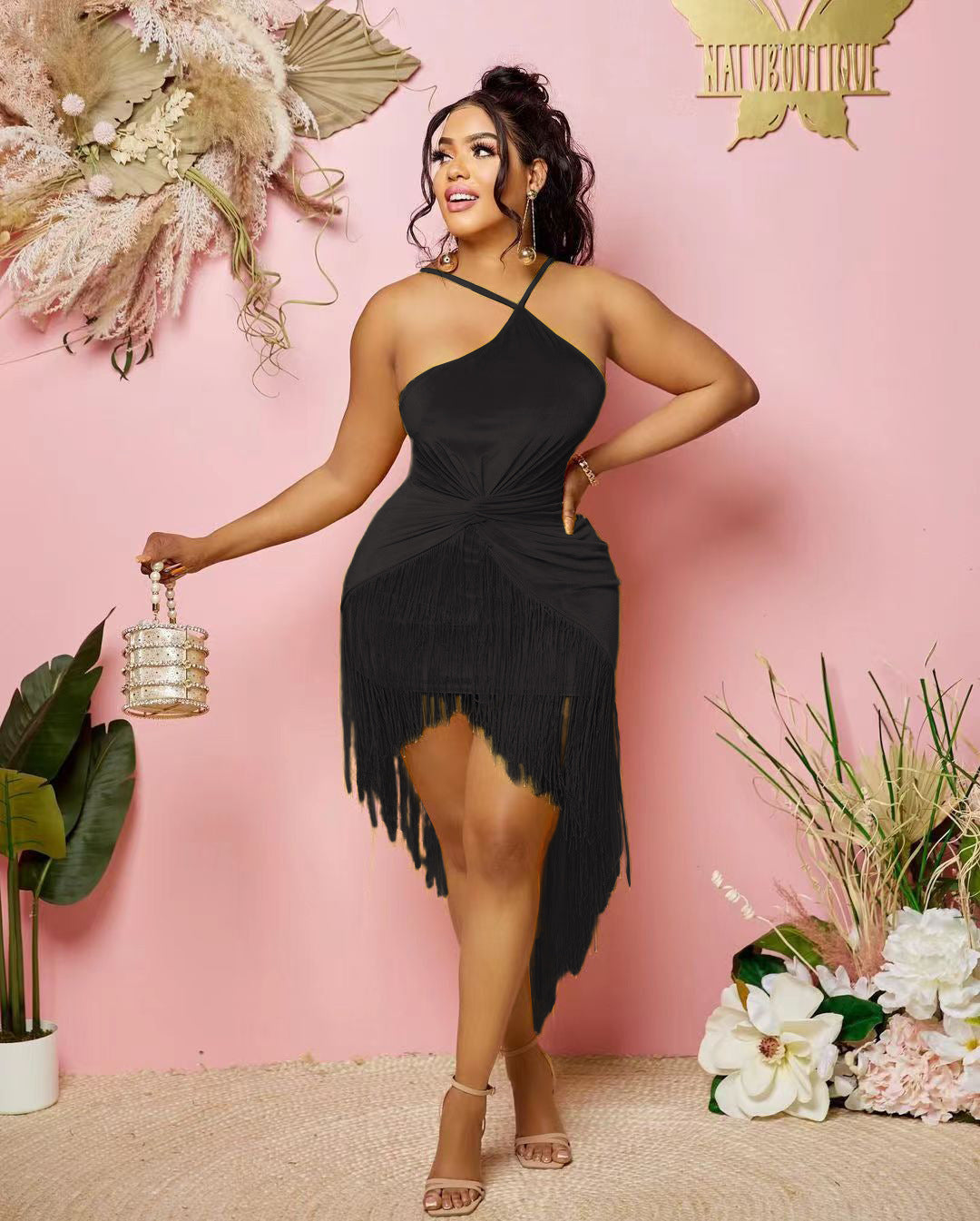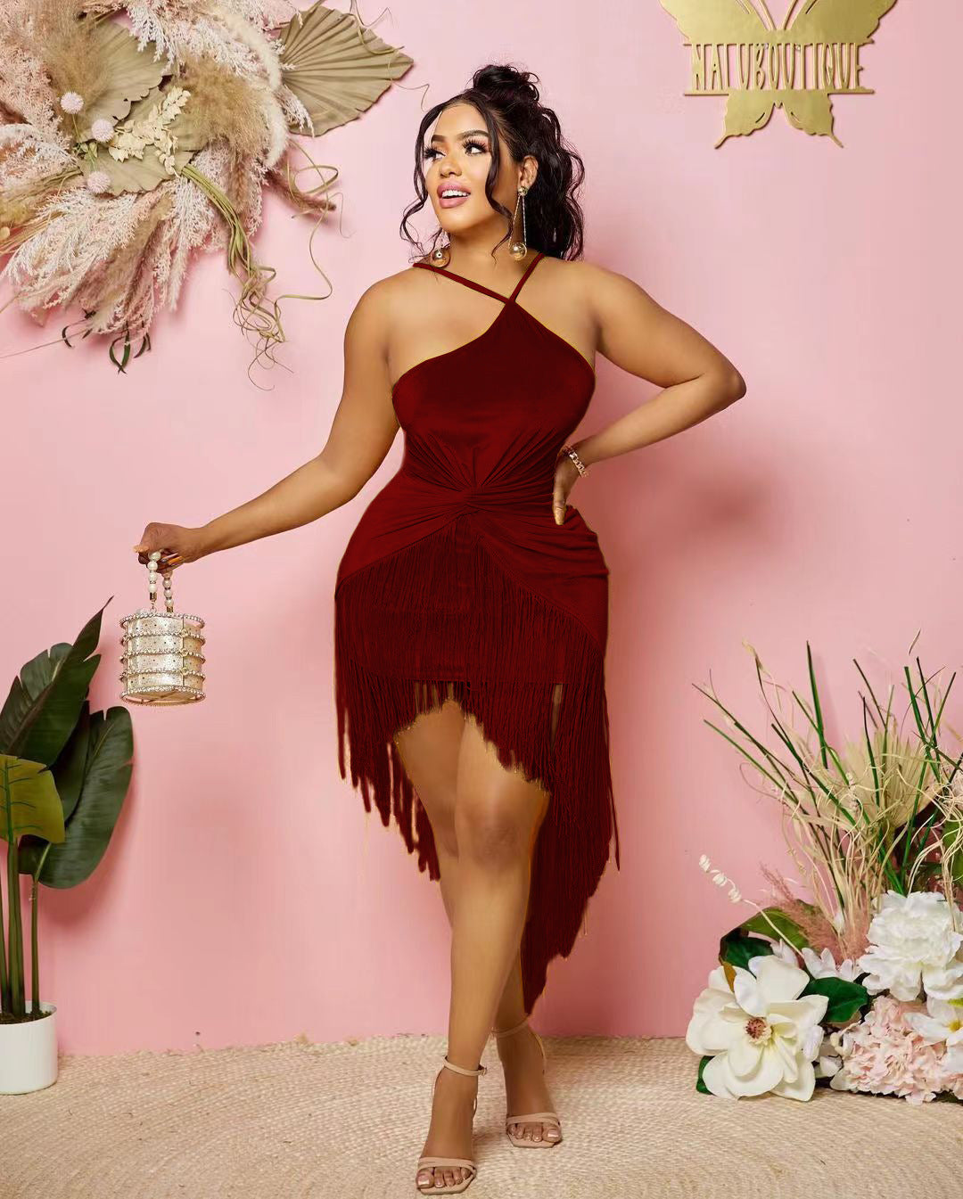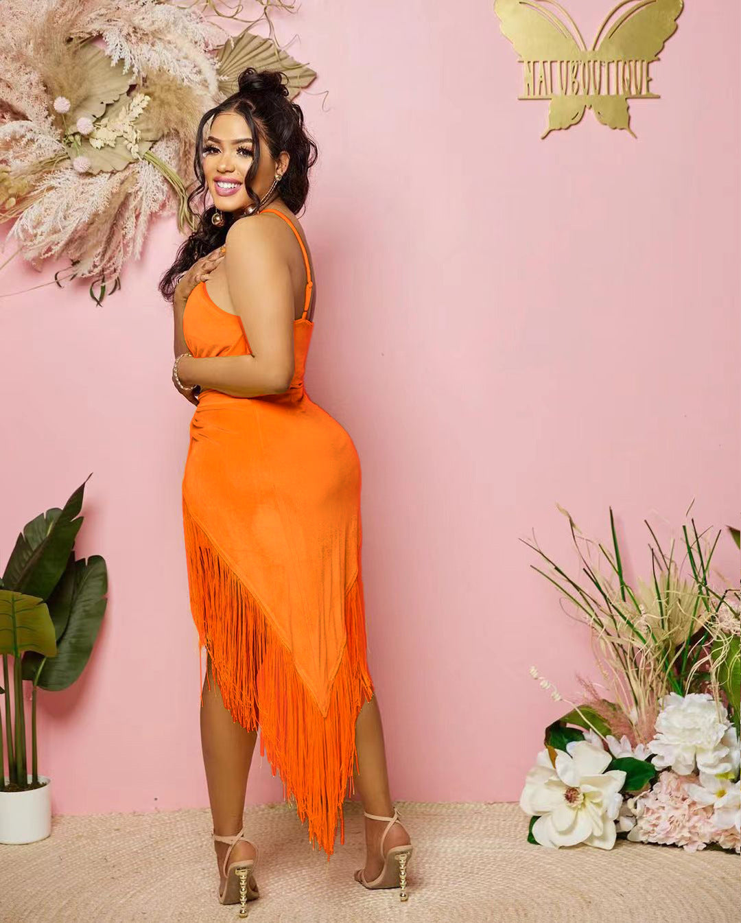 Sexy solid color hanging neck tassel dress AY2814