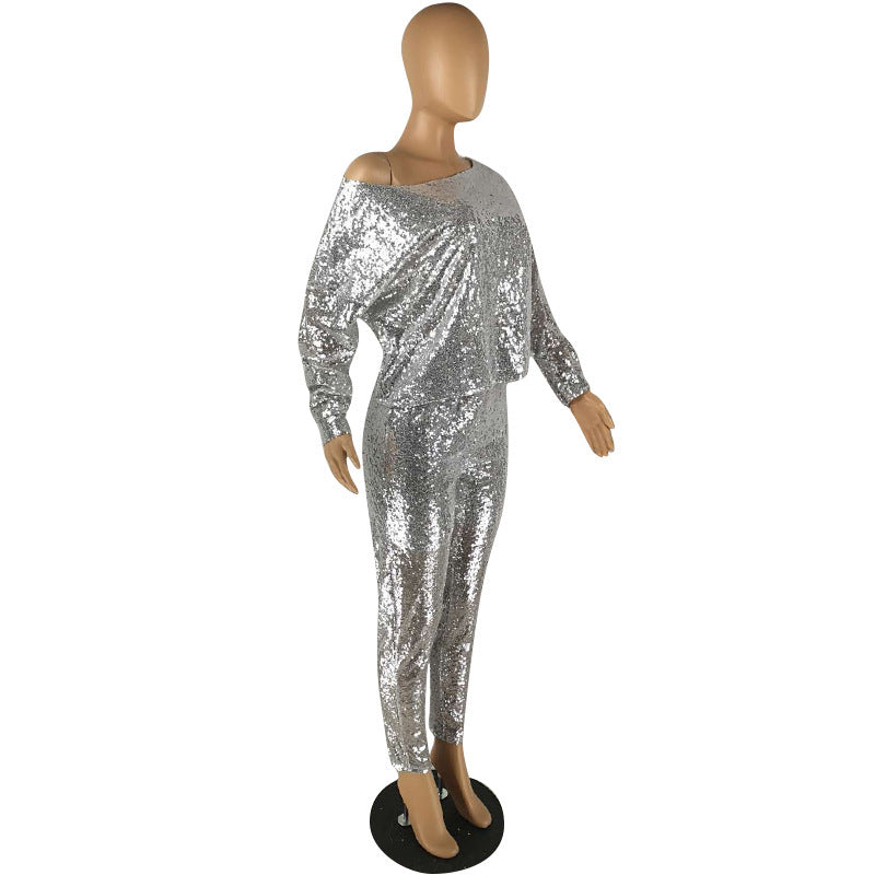 Sequin sexy strapless long sleeve two-piece suit