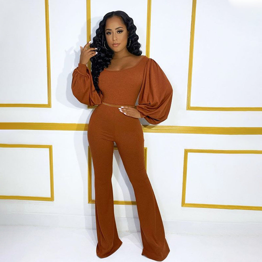 Hot sale solid color lantern sleeve flared pants two-piece suit