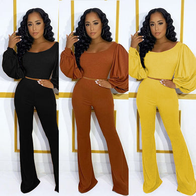 Hot sale solid color lantern sleeve flared pants two-piece suit