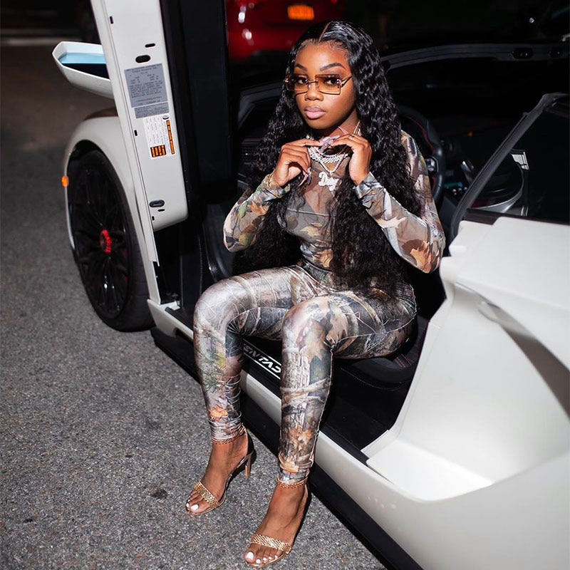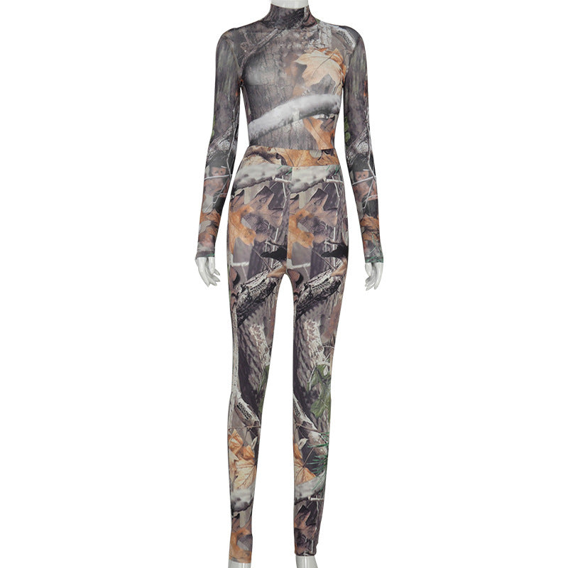 Sexy Leaf Print Long Sleeve Jumpsuit Trousers Set