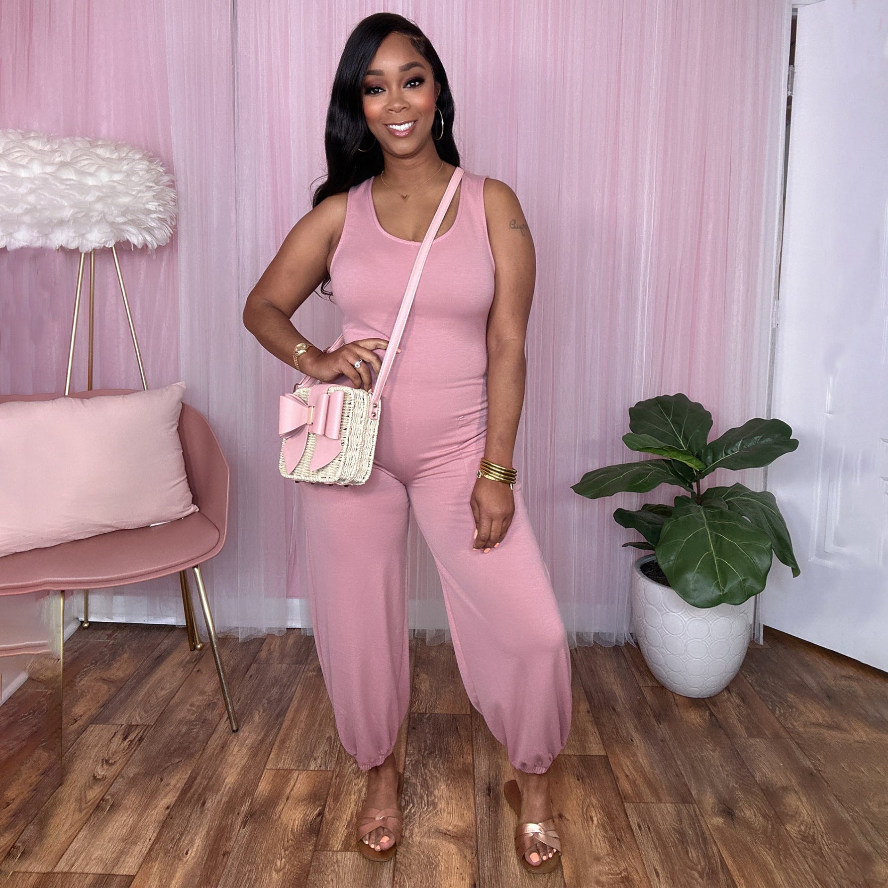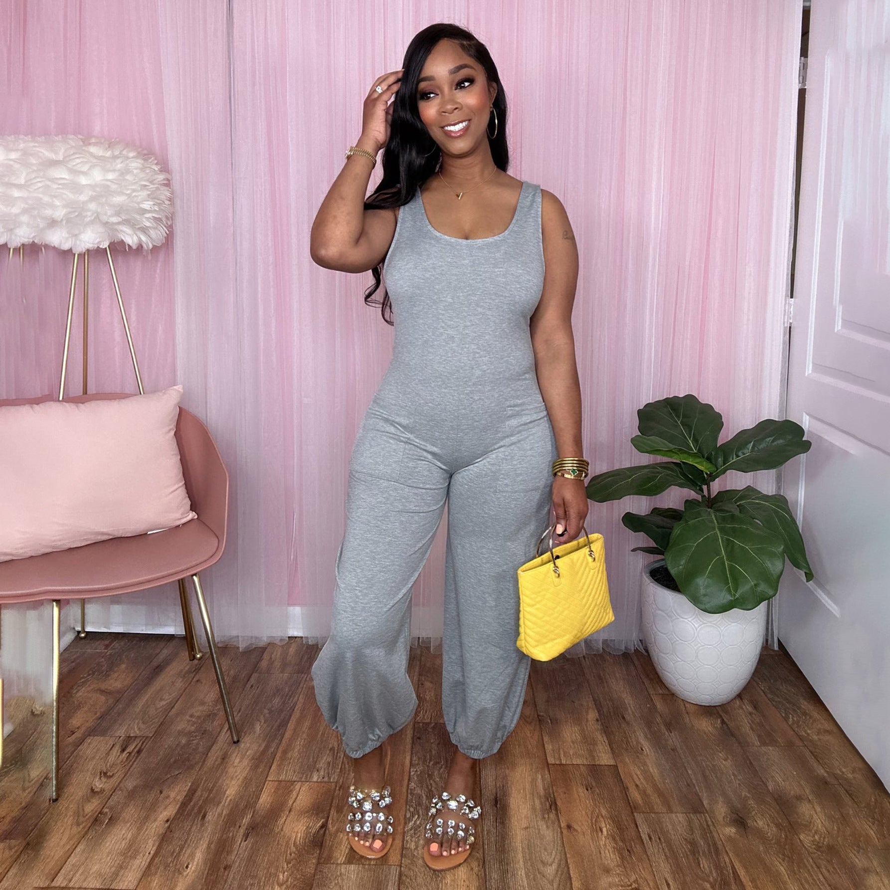 Solid color U-neck sleeveless shoulder strap loose casual jumpsuit AY2812