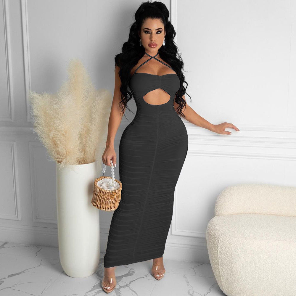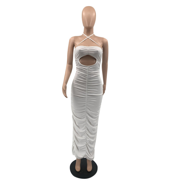 Solid color sling pleated hole long dress AY1081