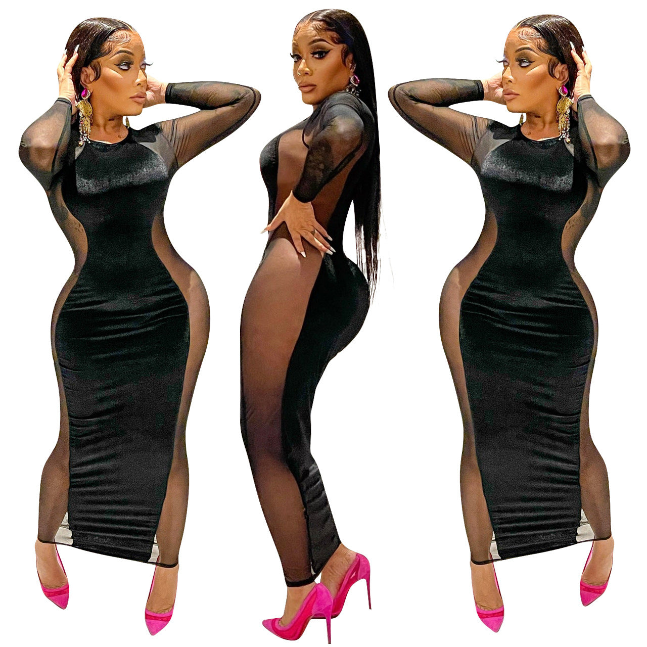 Sexy Velvet Mesh Panel Dress(AY1883)