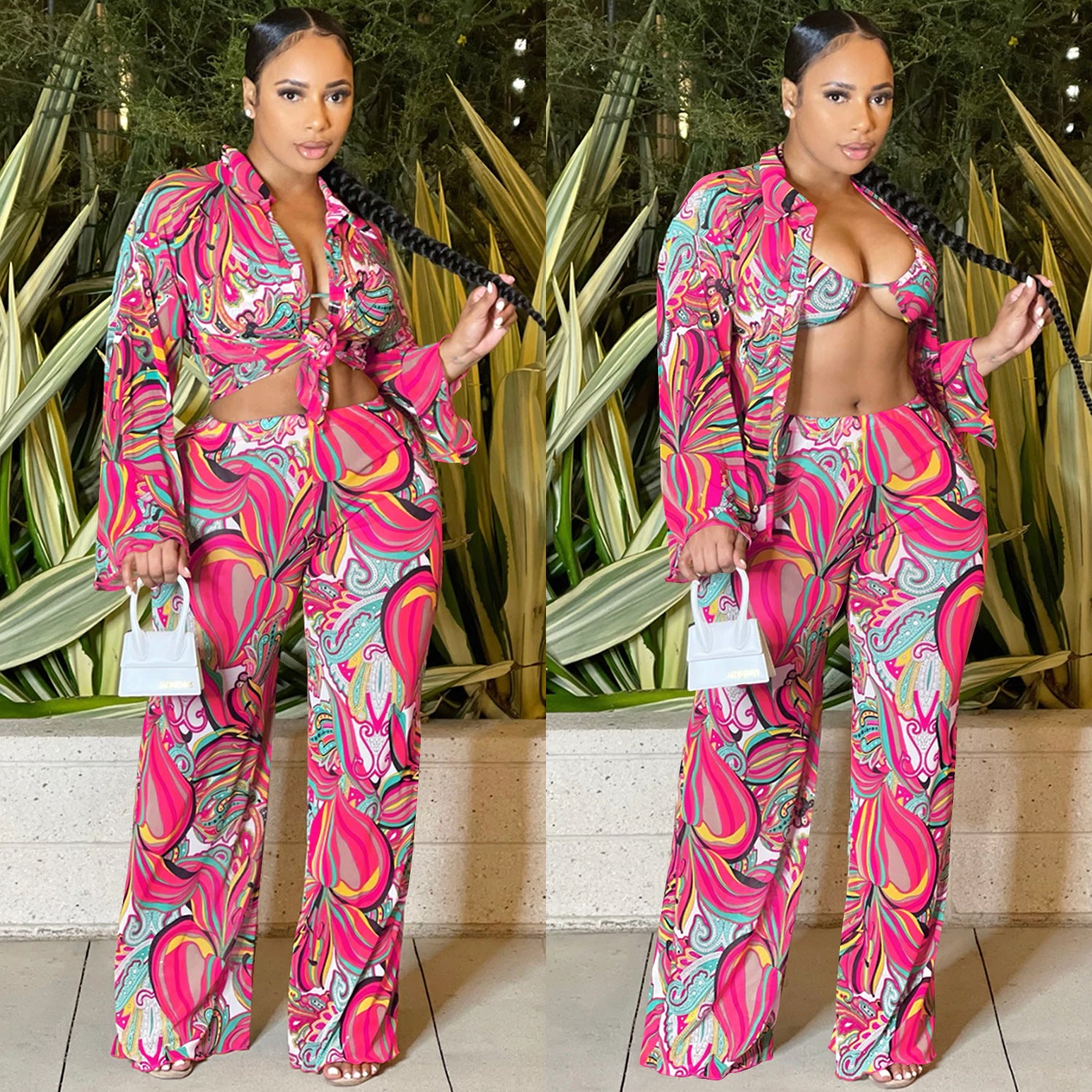 Sexy mesh perspective printed long sleeve three piece set AY2172