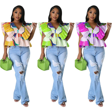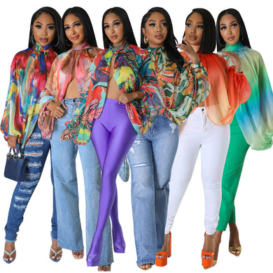 Lace up printed chiffon shirt bat sleeve top AY2900