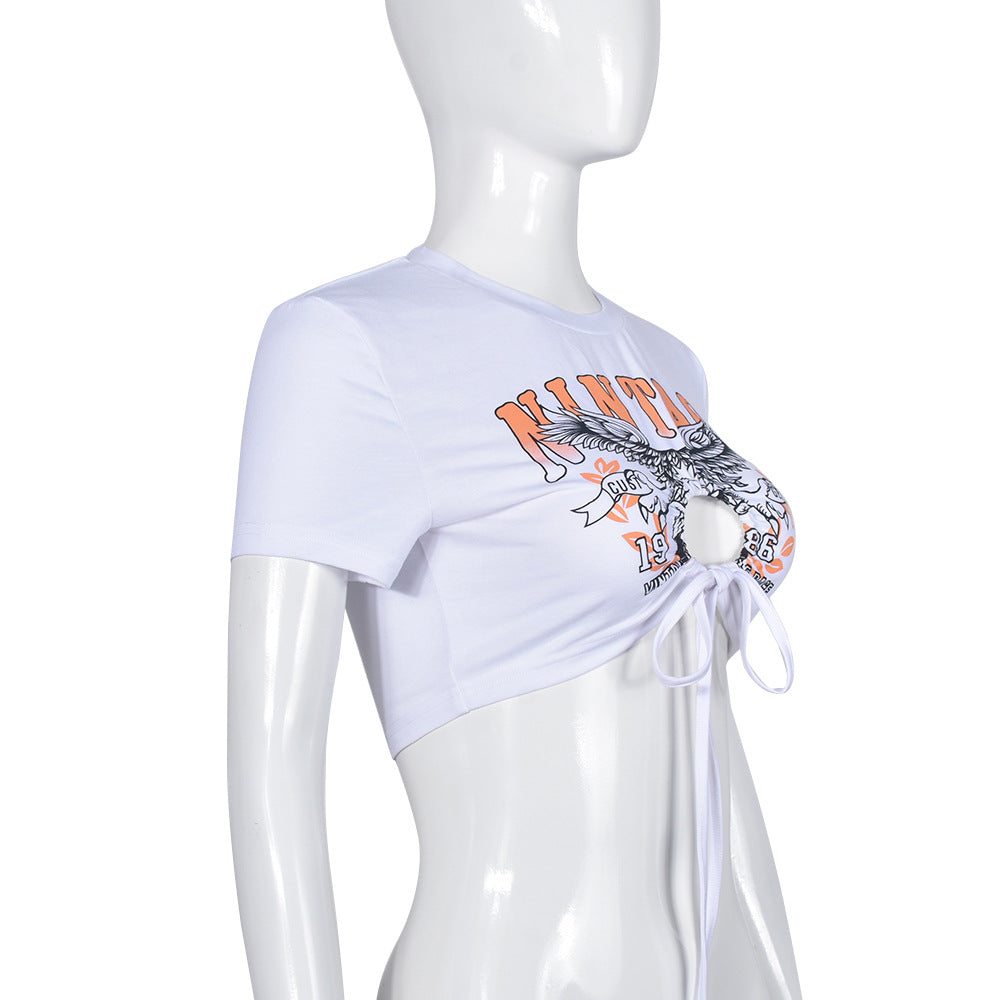 • Load image into Gallery viewer, Hollow letter short sleeved lace up top AY2768