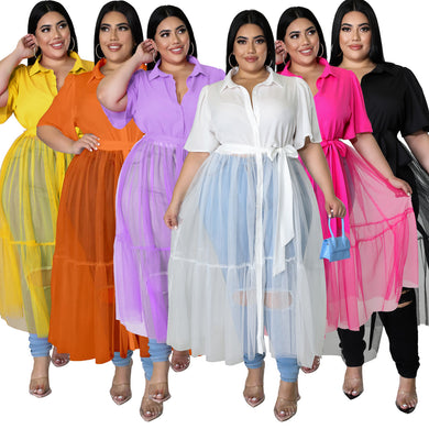 Lapel Short Sleeve Shirt Mesh Panel Dress(AY2289)