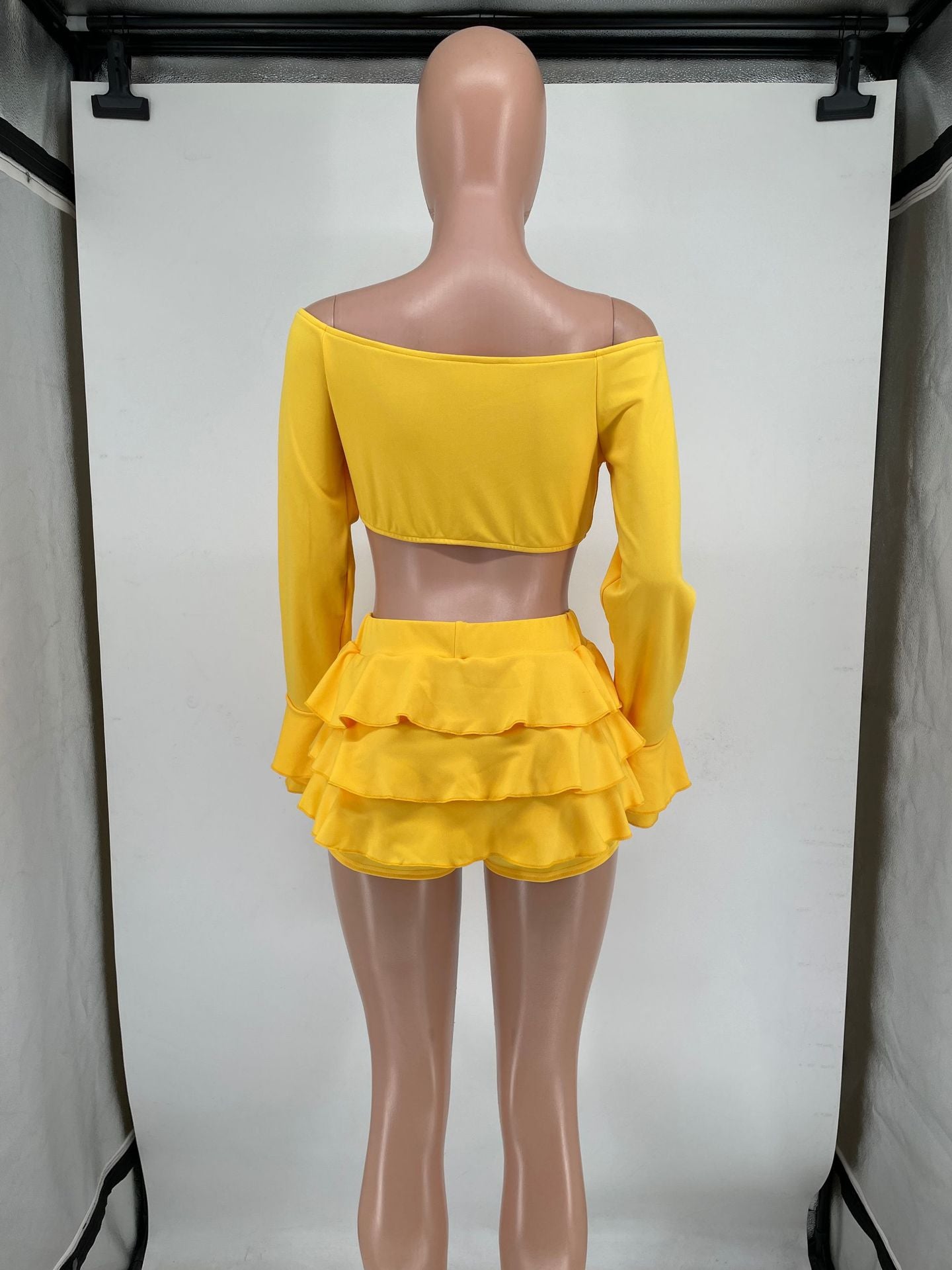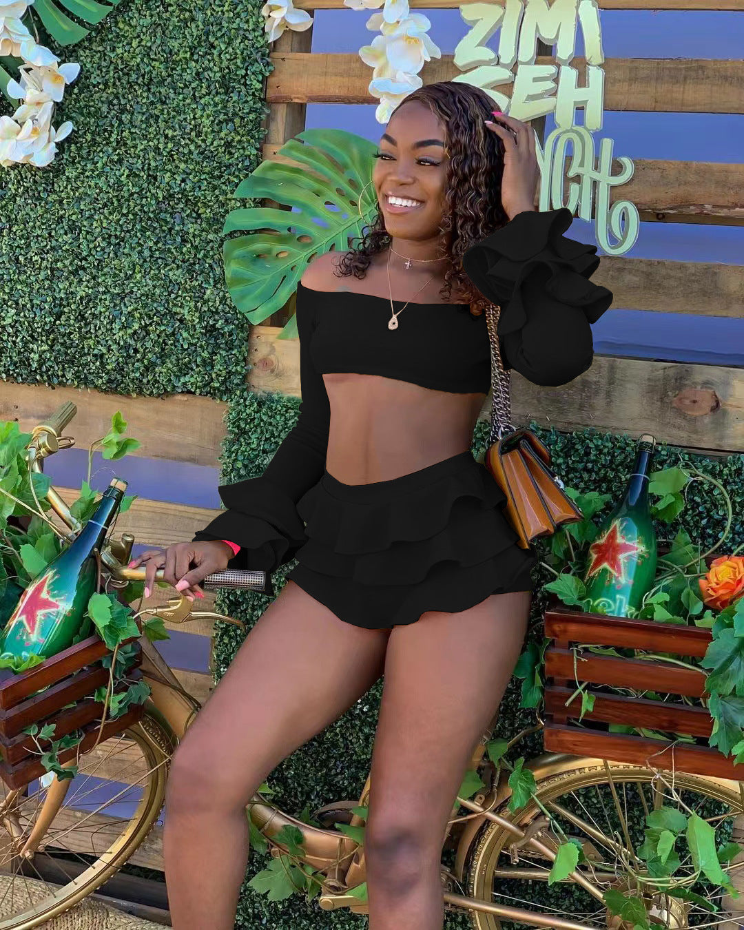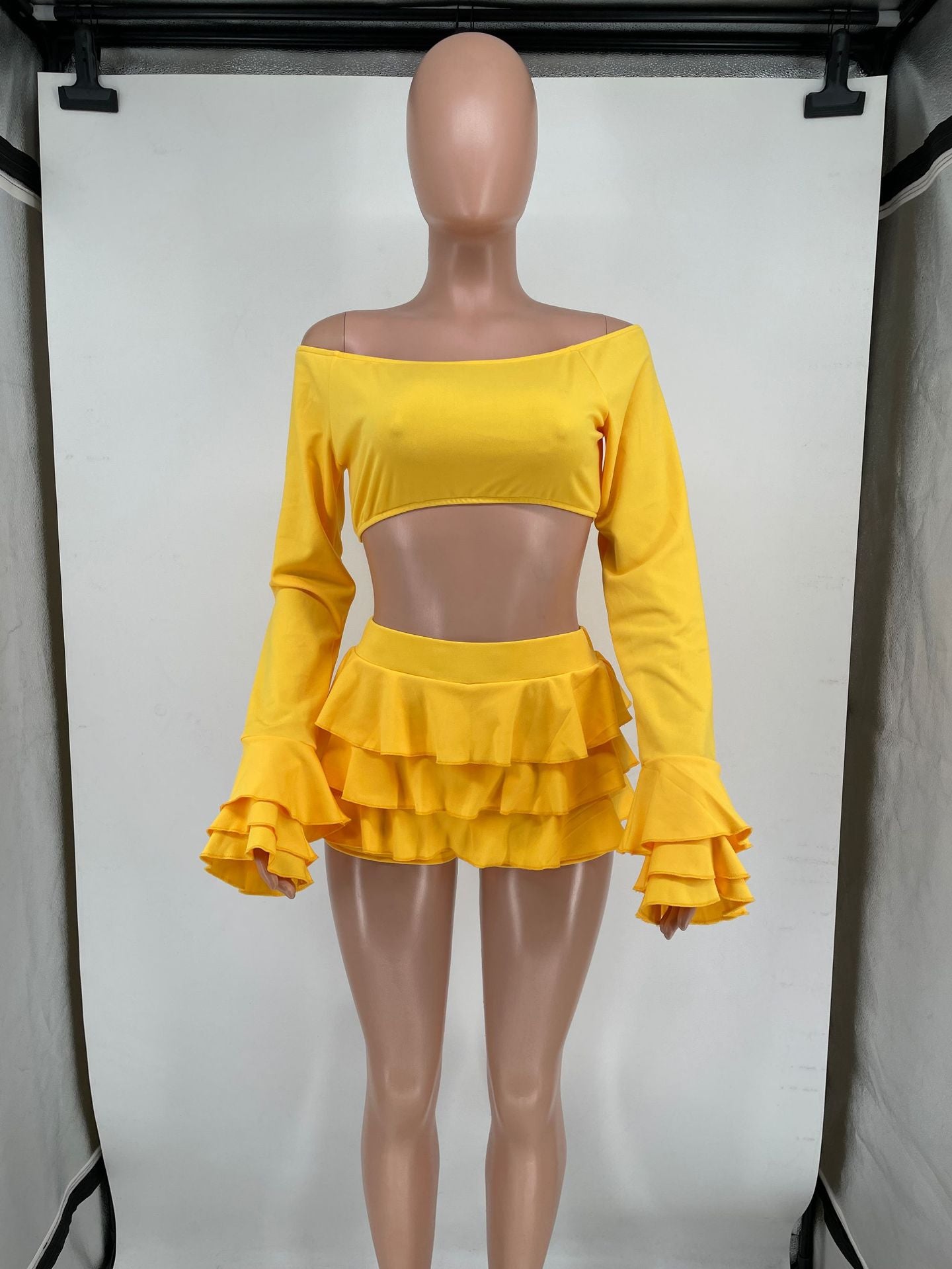 Cute off shoulder wooden ear edge bubble sleeve two-piece set AY2747