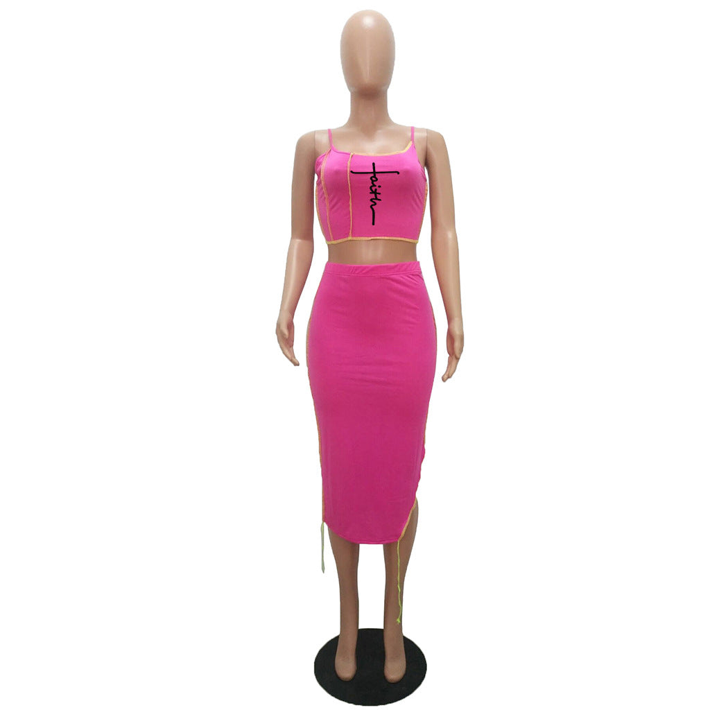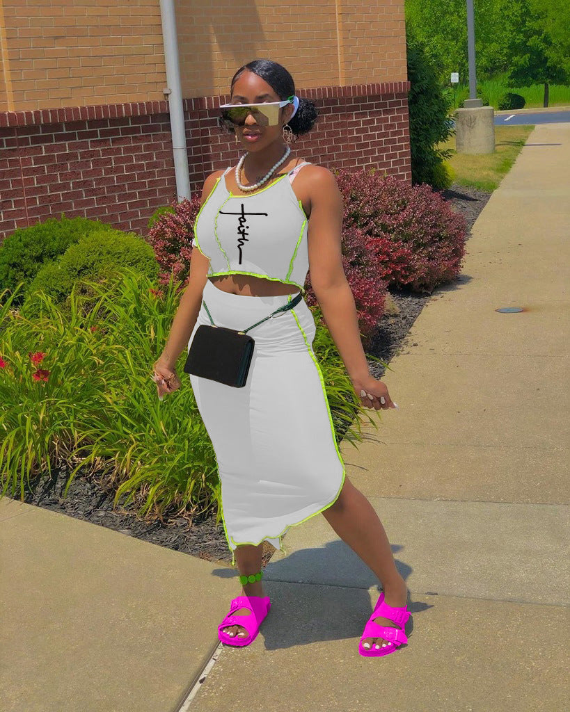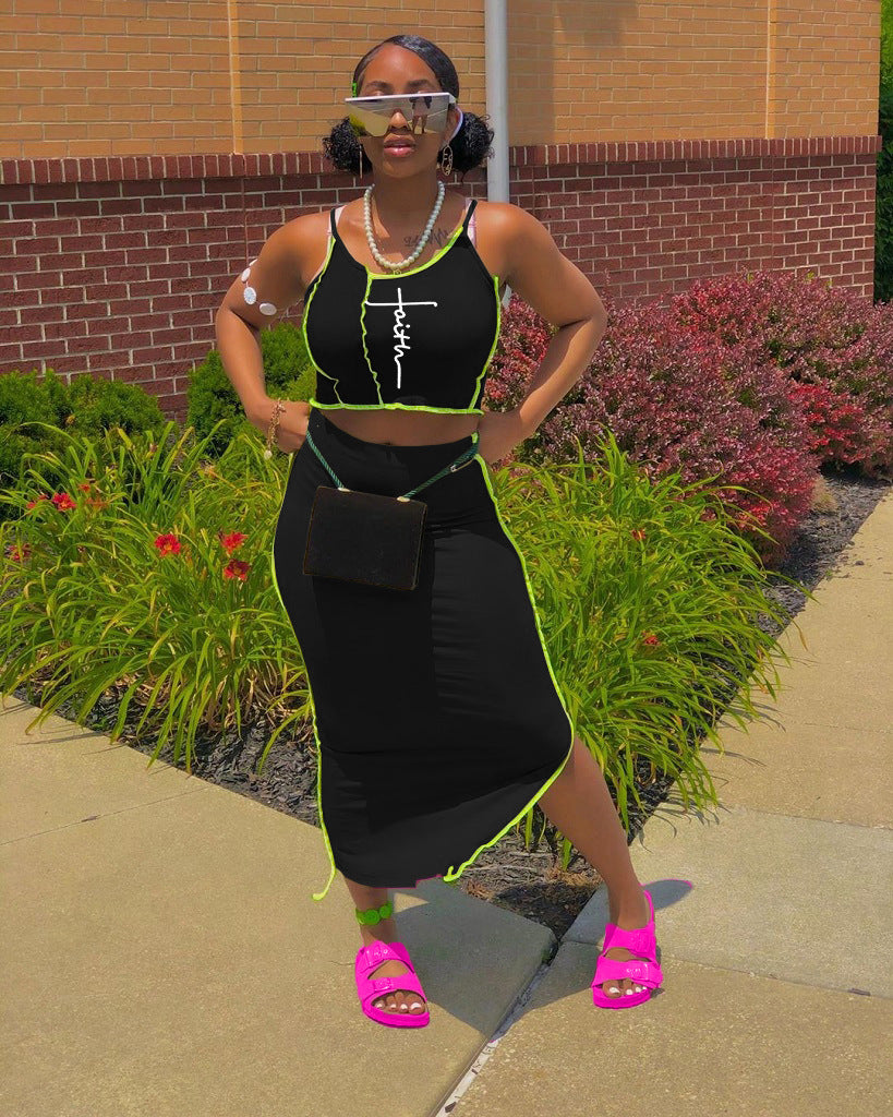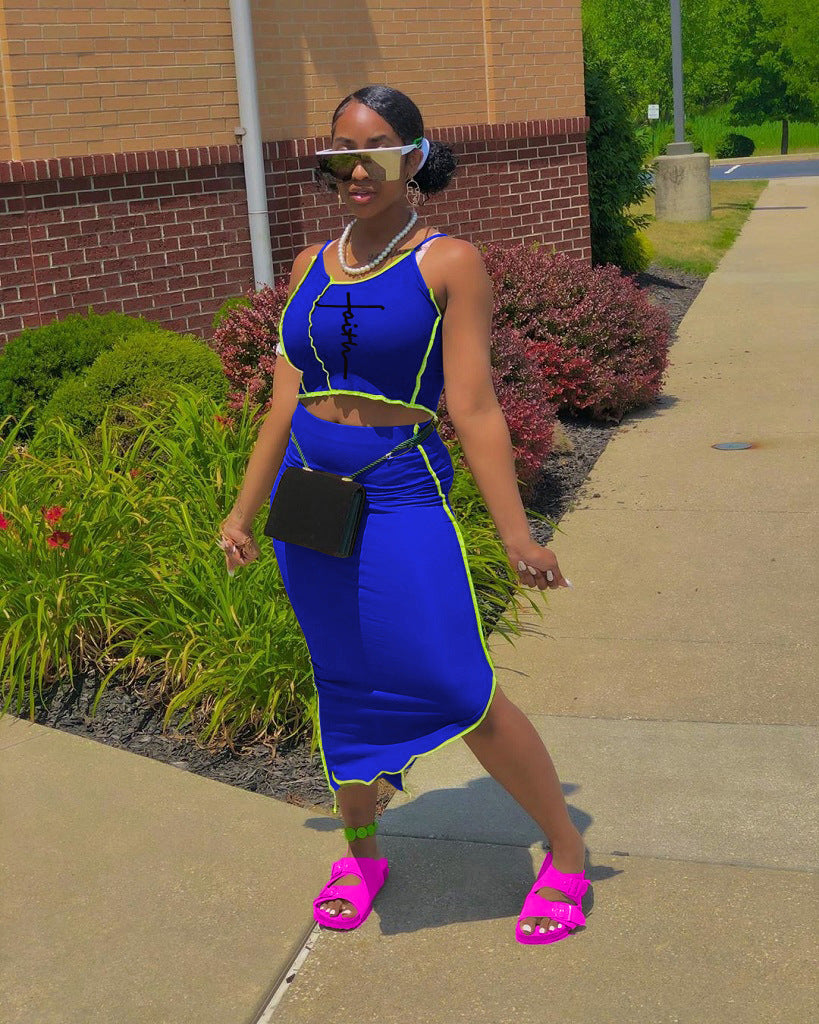 Fashion Letter Contrast Color Sling Pack Hip Skirt Two Piece Set(AY1767)