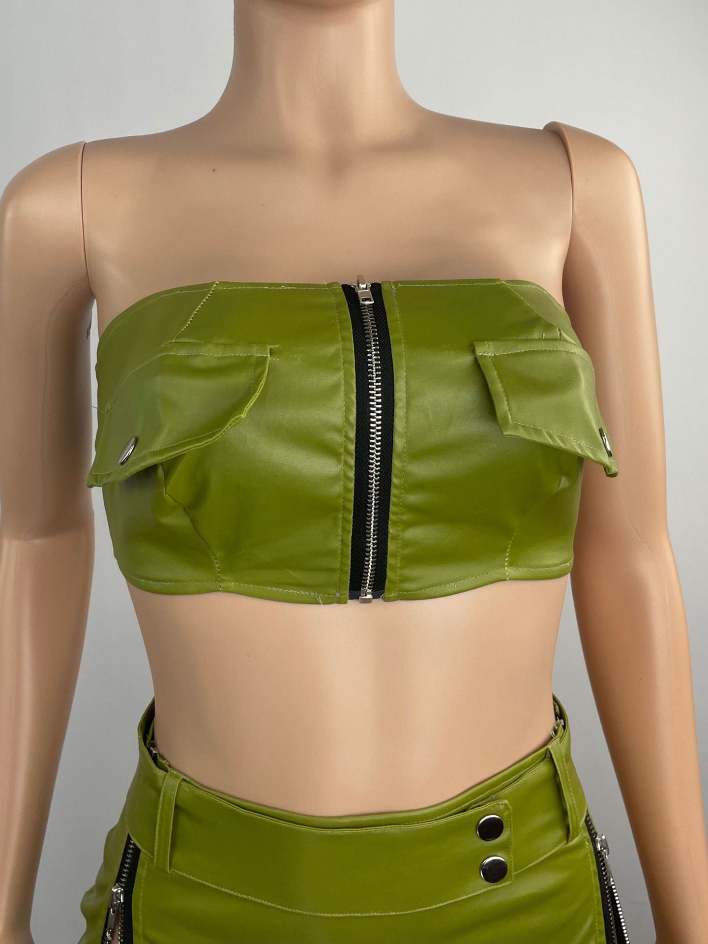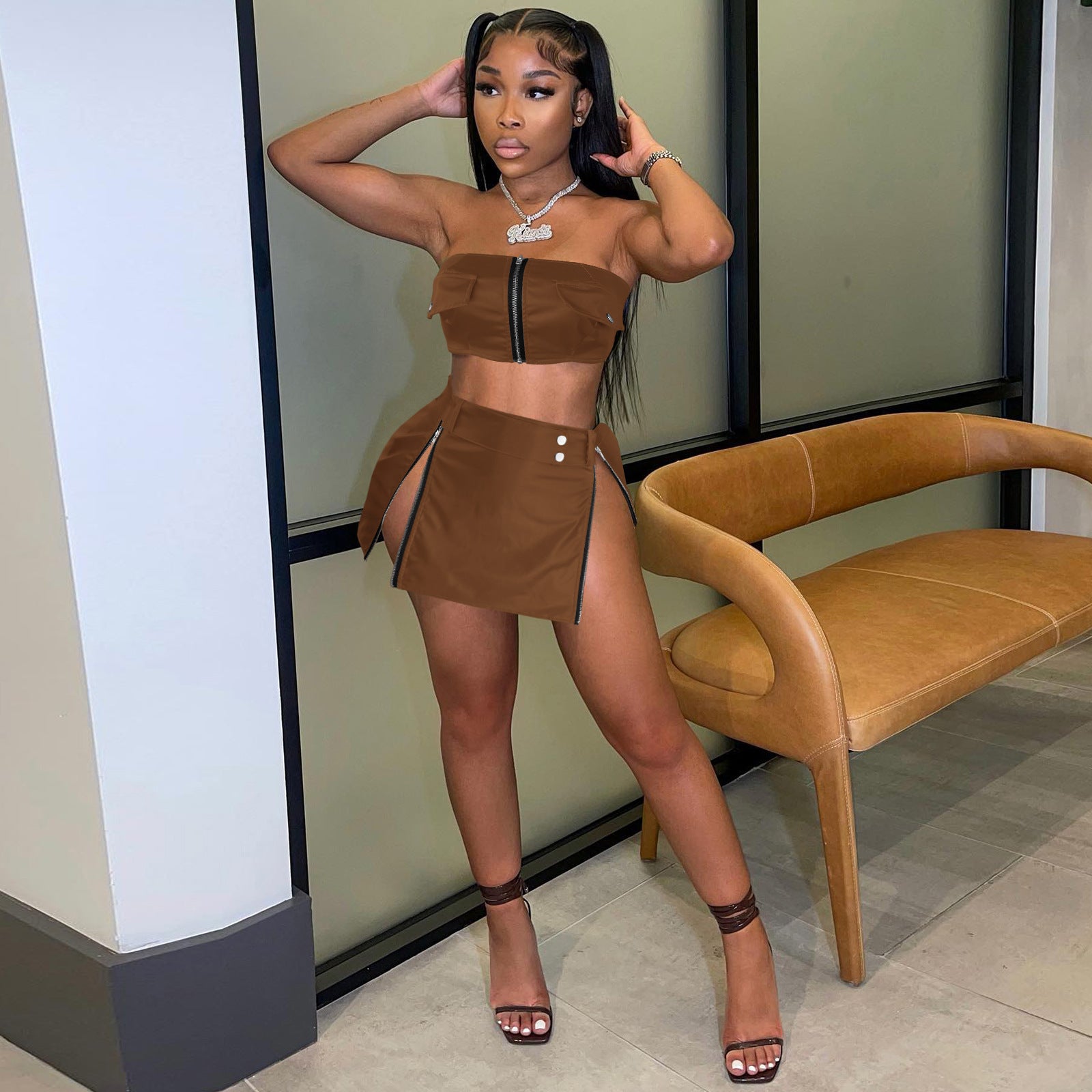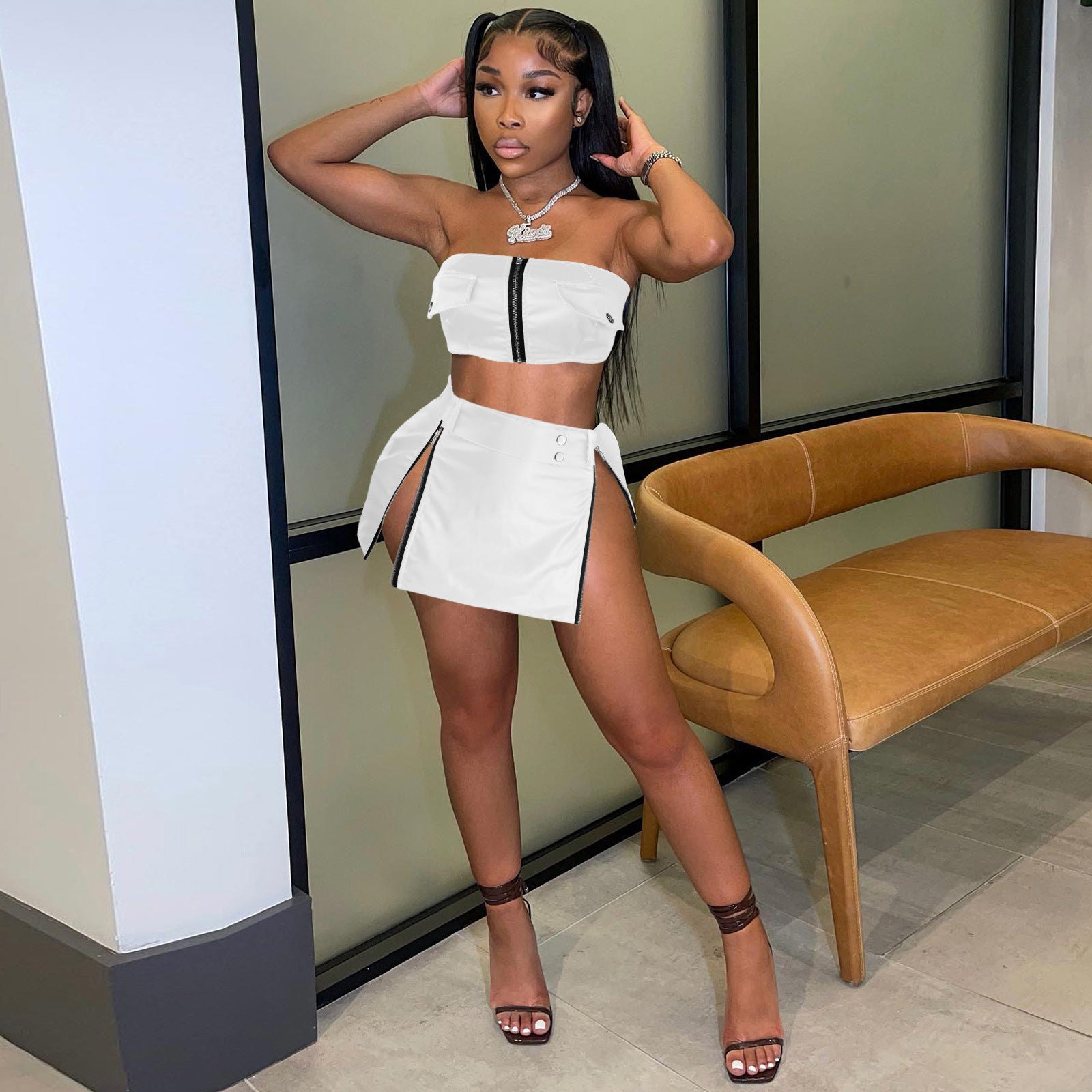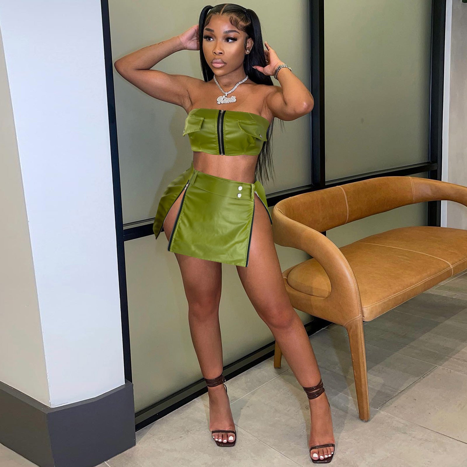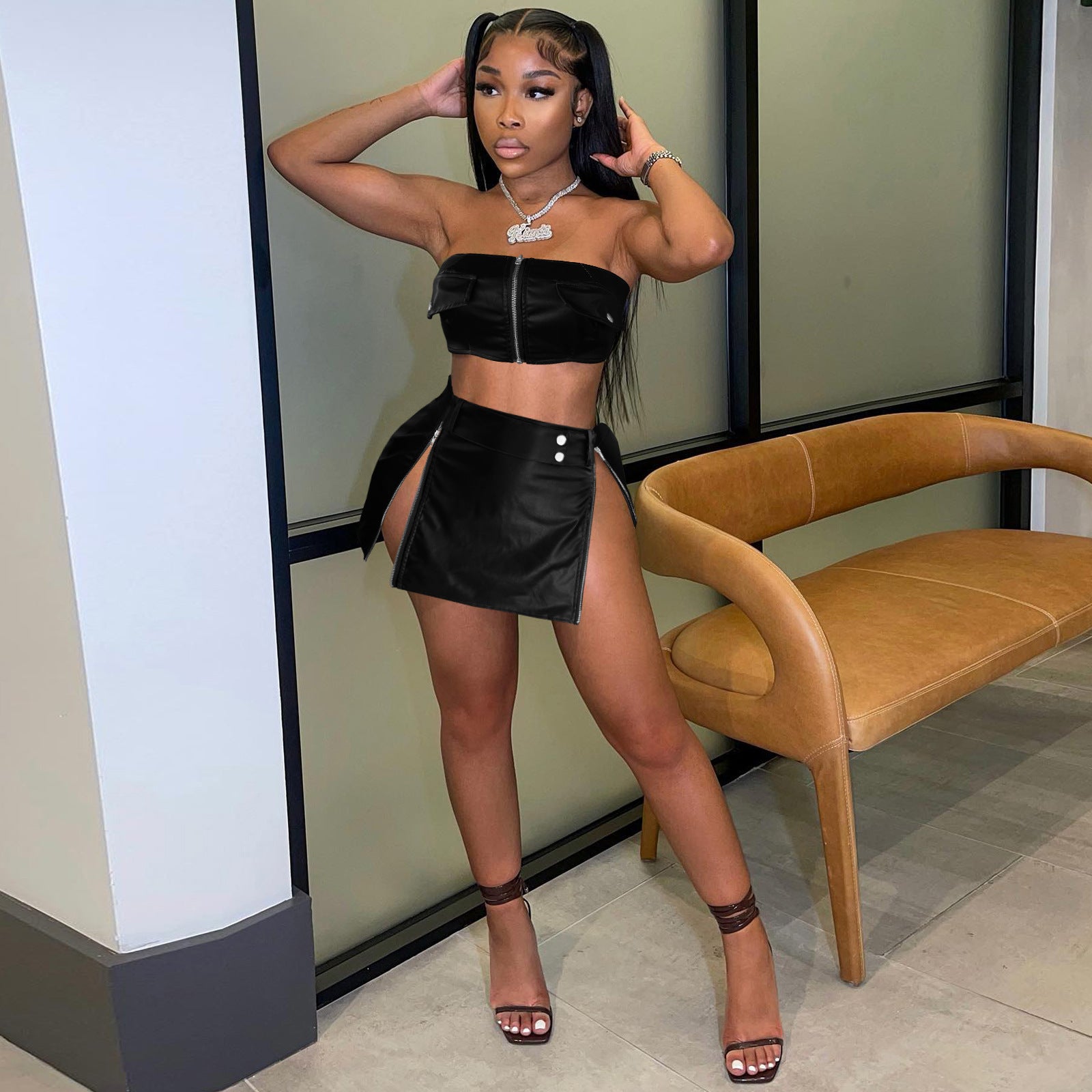 Solid PU Leather Sexy Two Piece Skirt Set AY2706