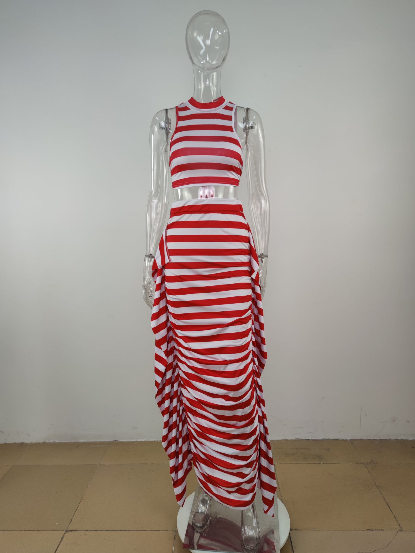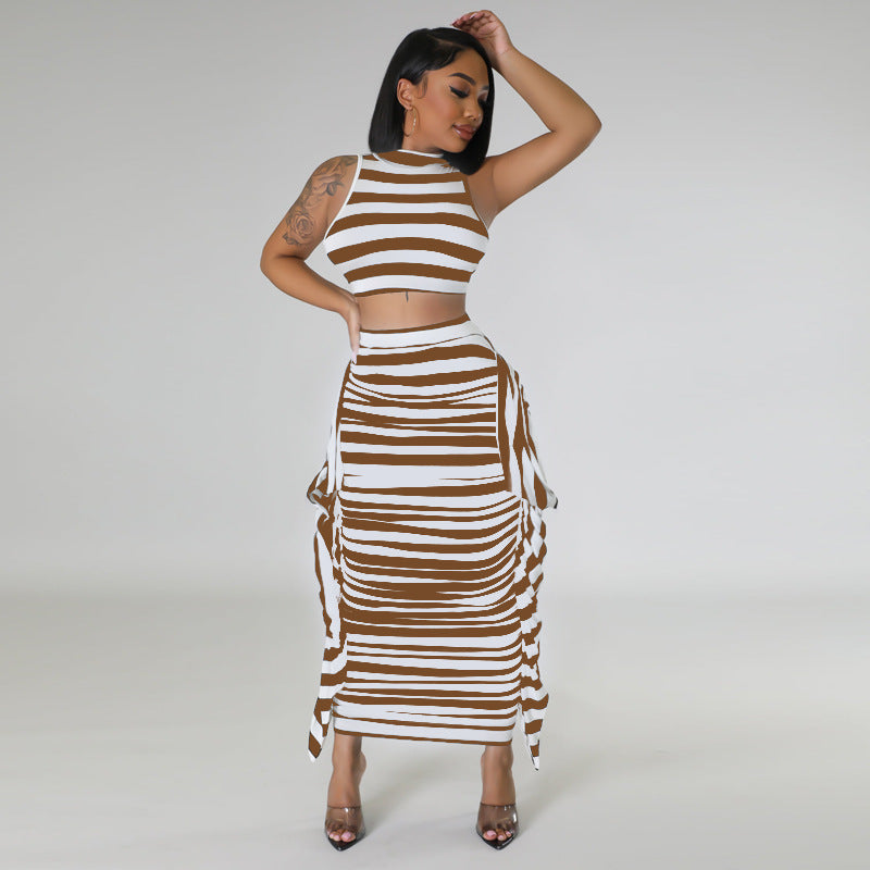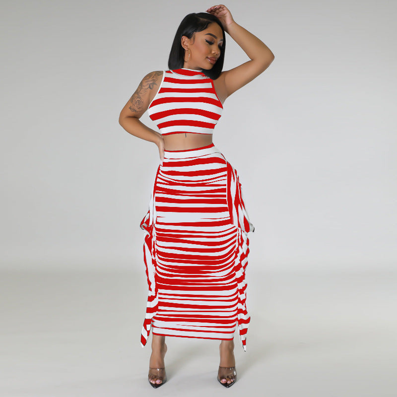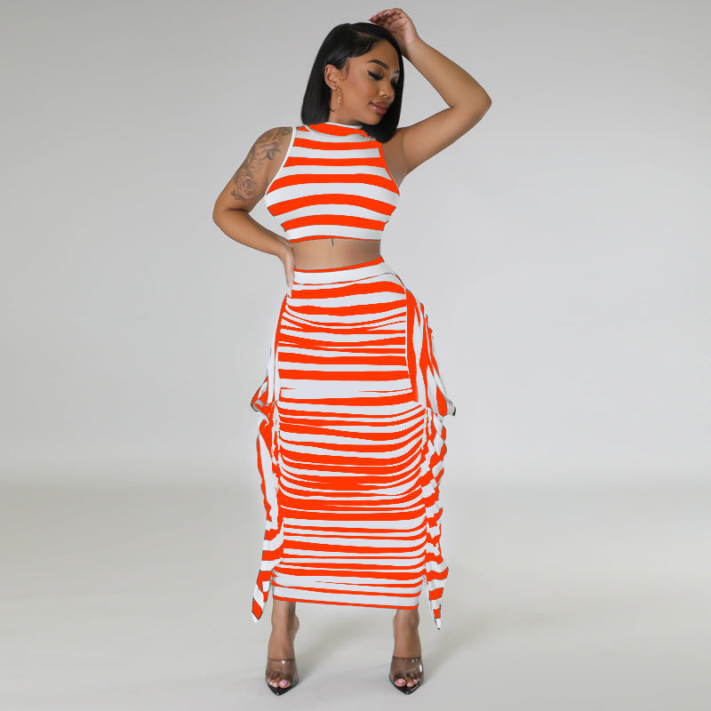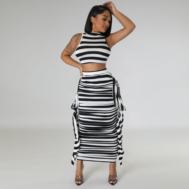 Striped open navel tight sleeveless vest skirt two-piece set AY2896