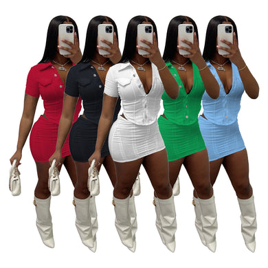 Camouflage printed lapel short sleeved split skirt set AY2740