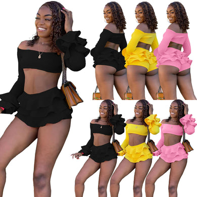 Cute off shoulder wooden ear edge bubble sleeve two-piece set AY2747