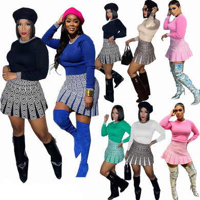 Fashion Printed Shirt Pleated Skirt Set(AY1748)