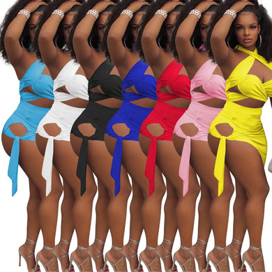 Sexy solid color pleated hollow skirt two-piece set(AY1661)