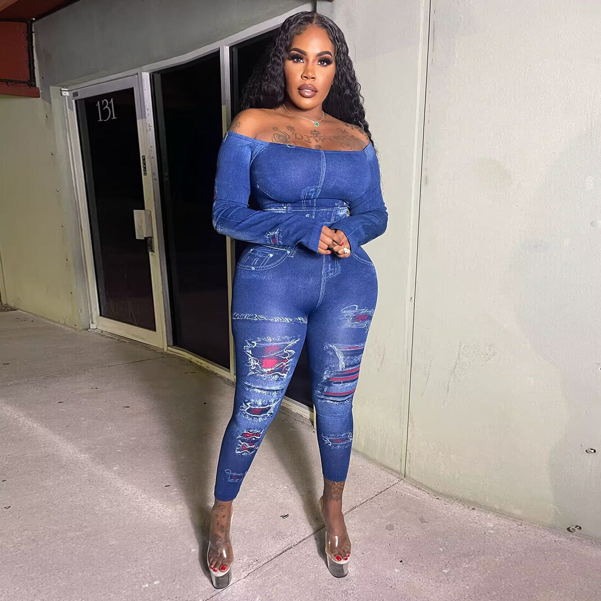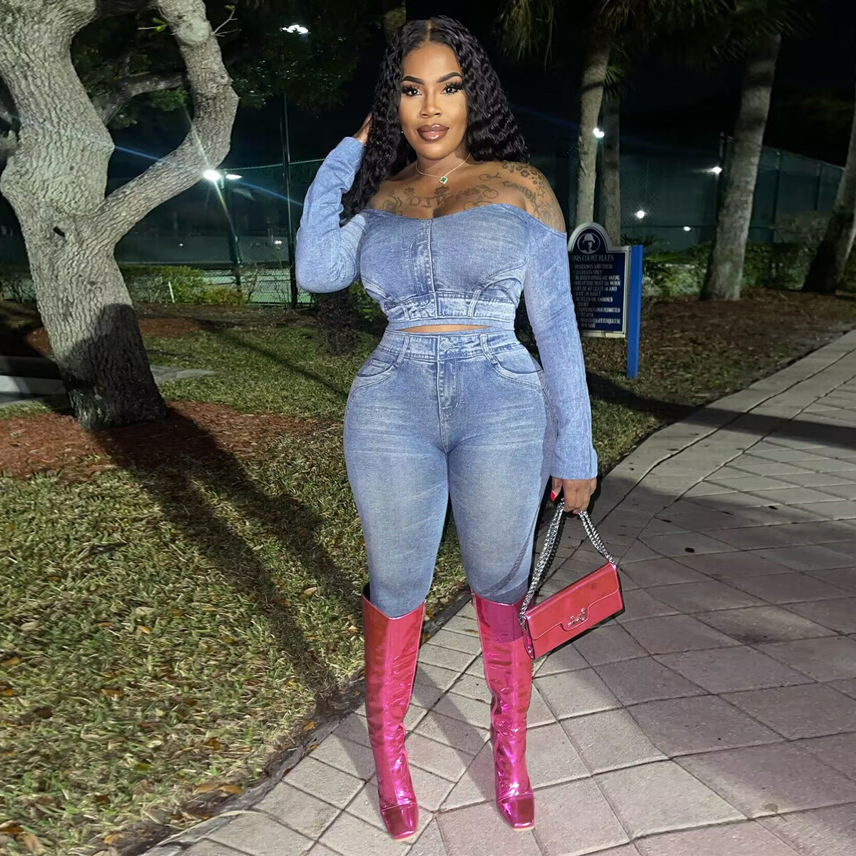 • Load image into Gallery viewer, New spring denim imitation positioning printing  two-piece suitAY2656