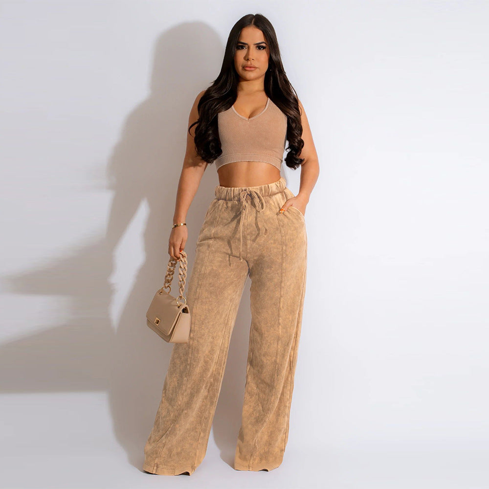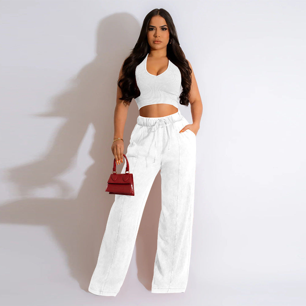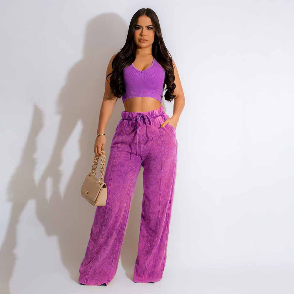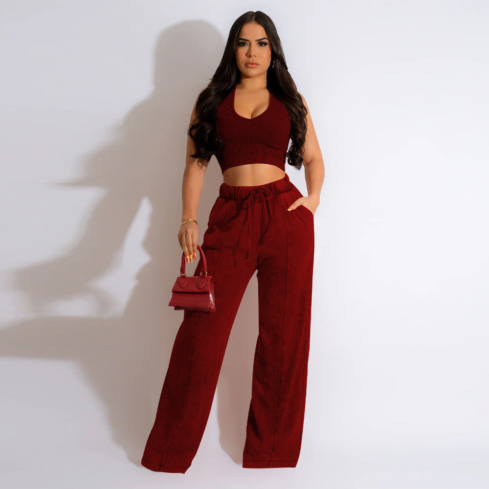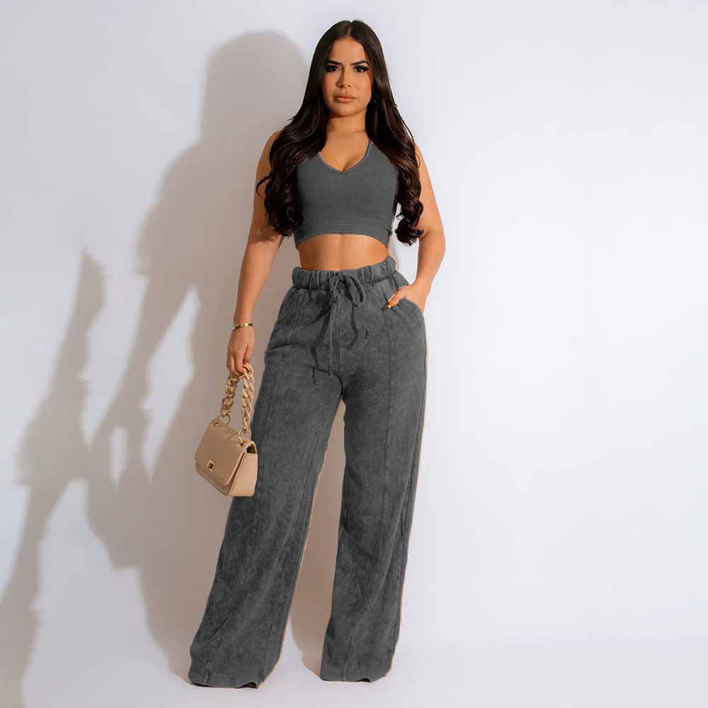 Sleeveless short top with elastic waist and wide leg pants set AY2854