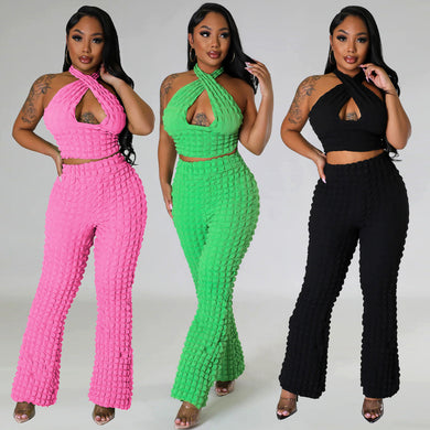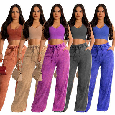 Sleeveless short top with elastic waist and wide leg pants set AY2854