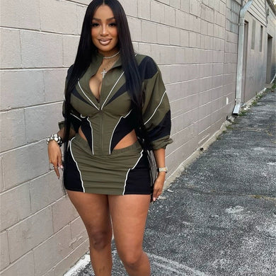 Casual contrast color long-sleeved jacket and short skirt suit AY3662