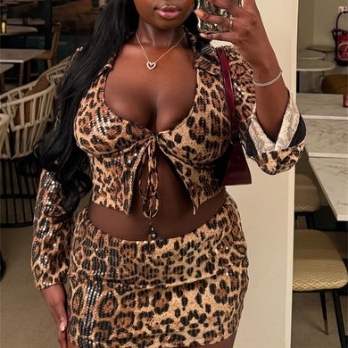 Sexy leopard print lace-up top and skirt set