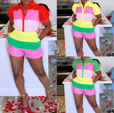 Multi-color spliced lantern sleeve shirt set AY3552