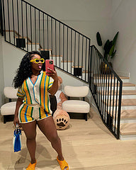 Casual Fashion Striped Lapel Top High Waist Shorts Set