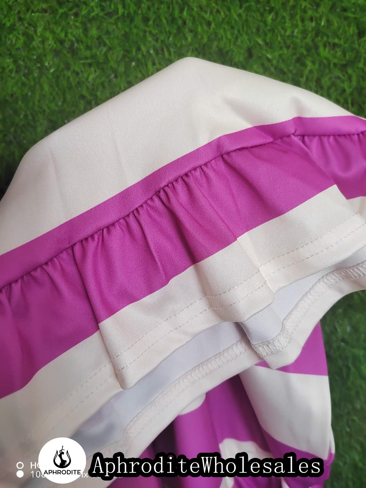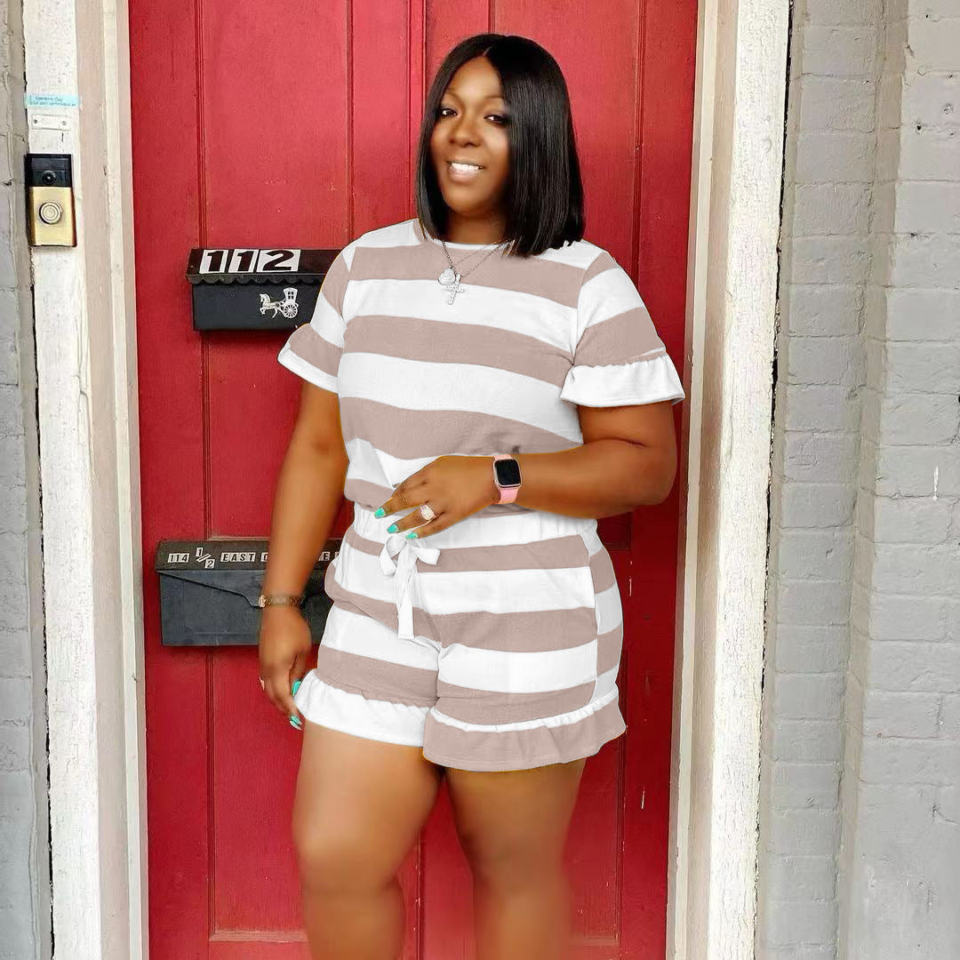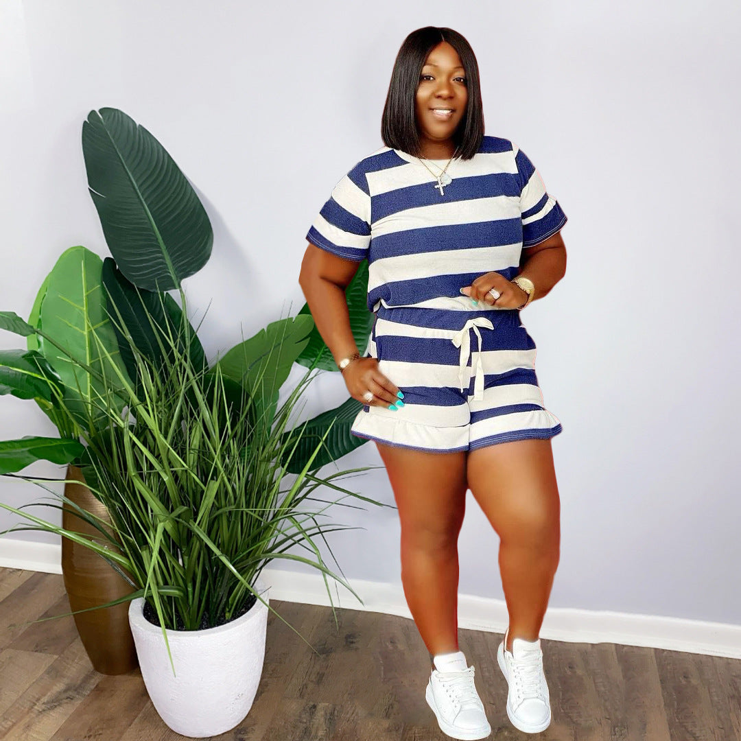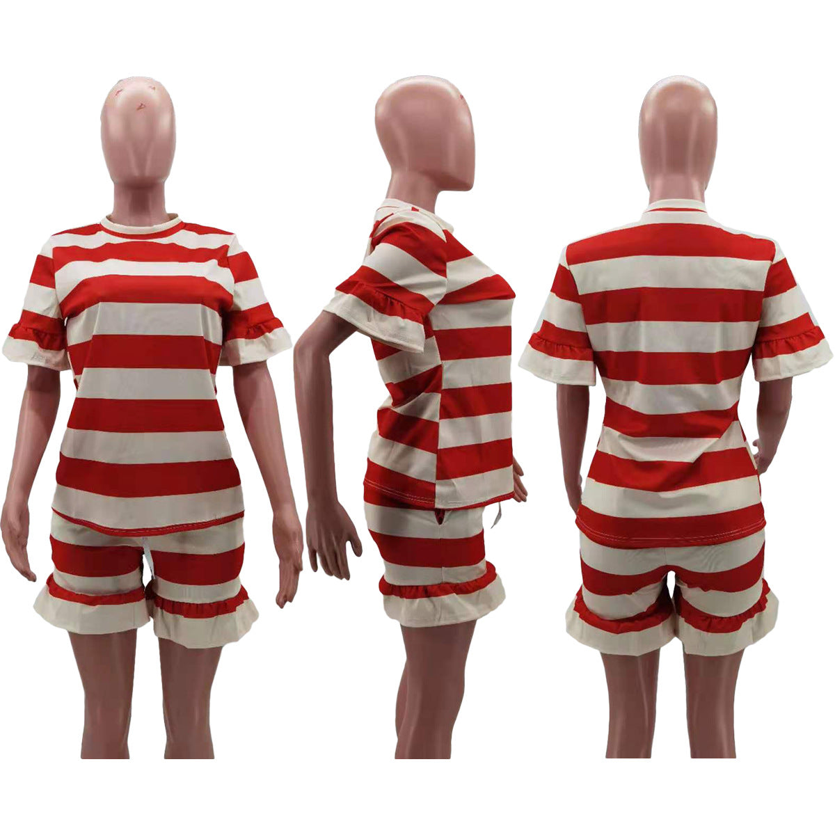 Stripe Print Loose Wood Ear Edge Casual Short Sleeve T-shirt Set AY2729