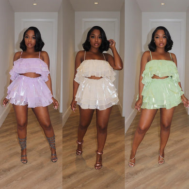 V-neck ruffle sleeve lace up short skirt set AY3381
