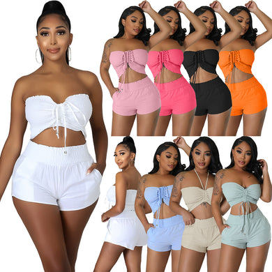Solid Color Fashion Wrapped Chest Casual two-piece Set AY2730